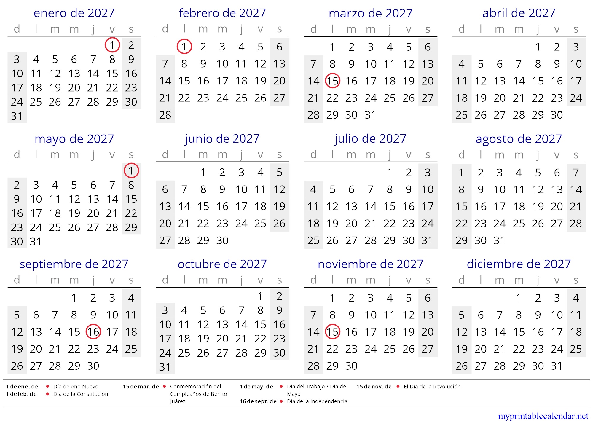 Yearly calendar for 2027, Mexico, Spanish jpg