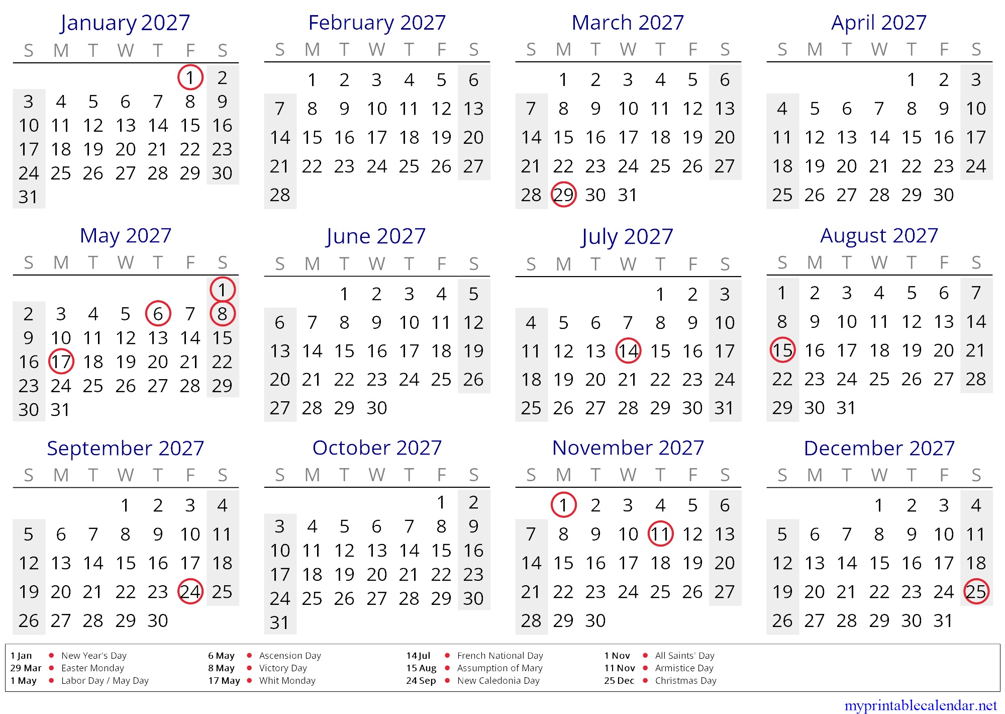 Yearly calendar for 2027, New Caledonia, in English jpg