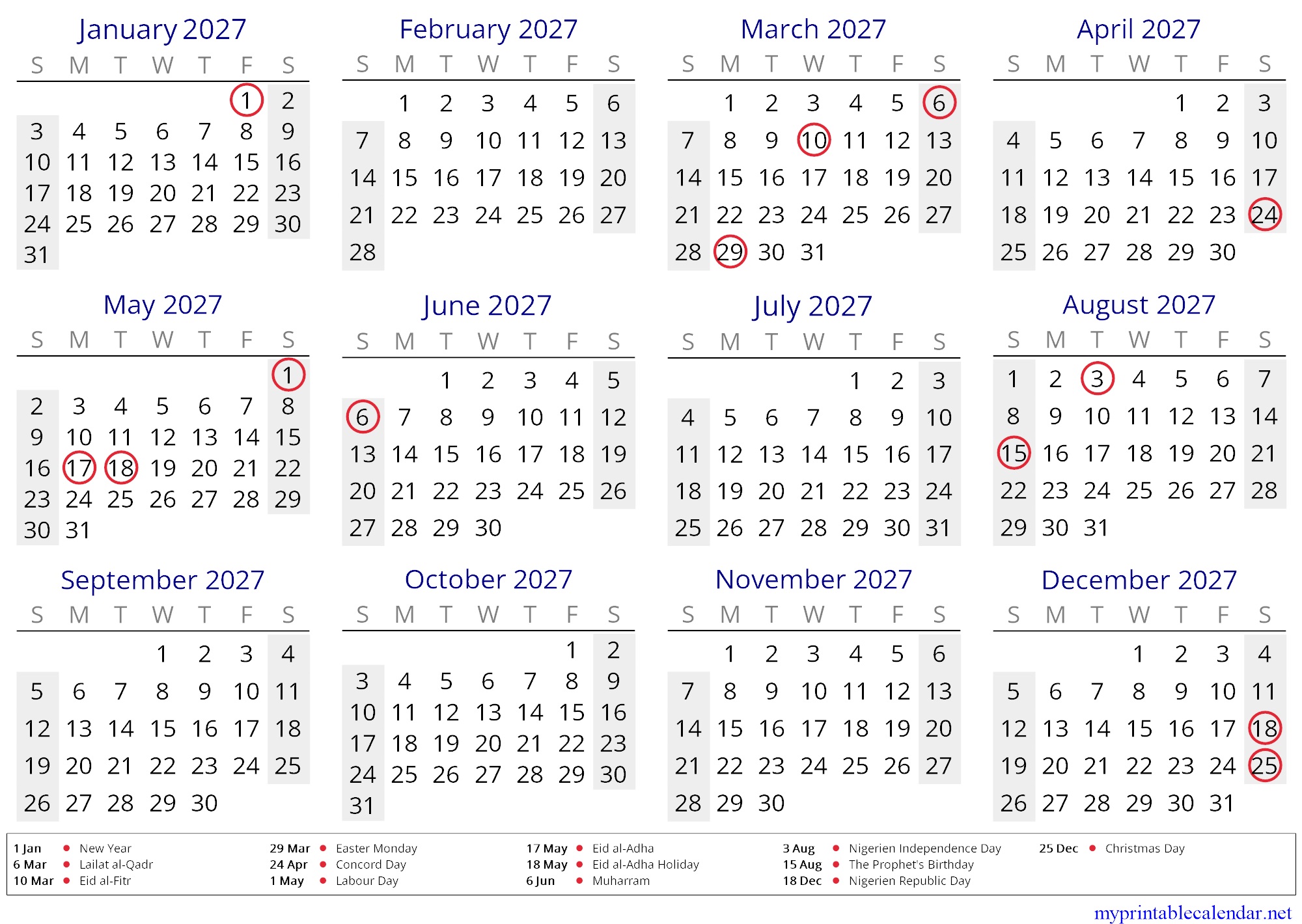 Yearly calendar for 2027, Niger, in English jpg