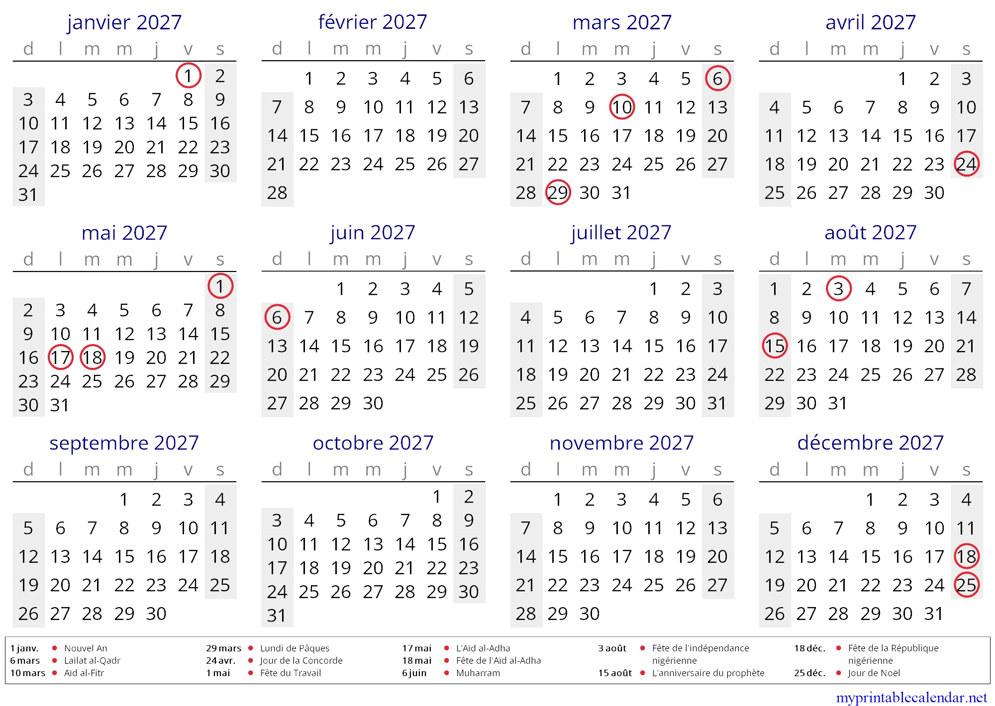Yearly printable calendar for Niger.