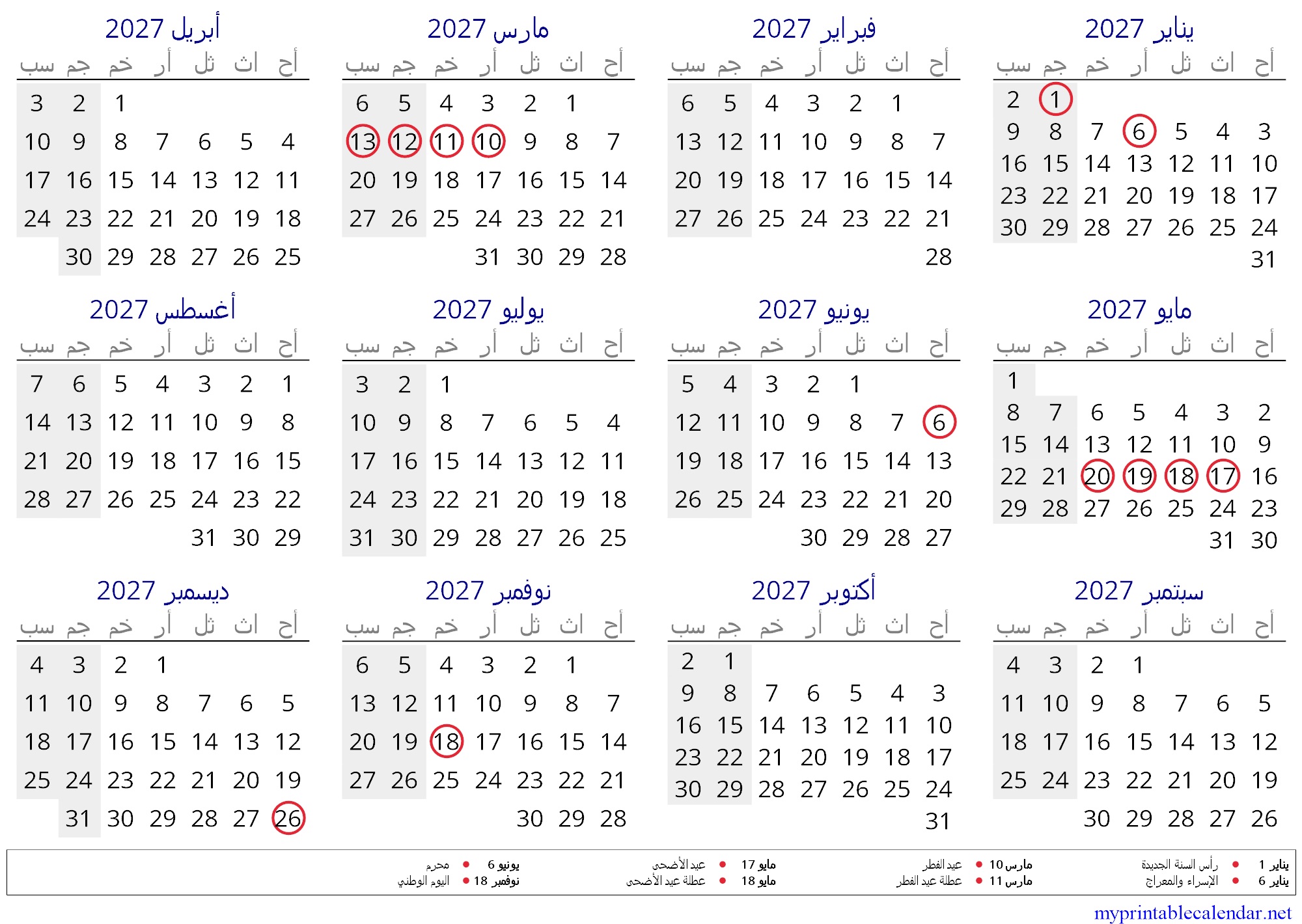 Yearly calendar for 2027, Oman, Arabic jpg