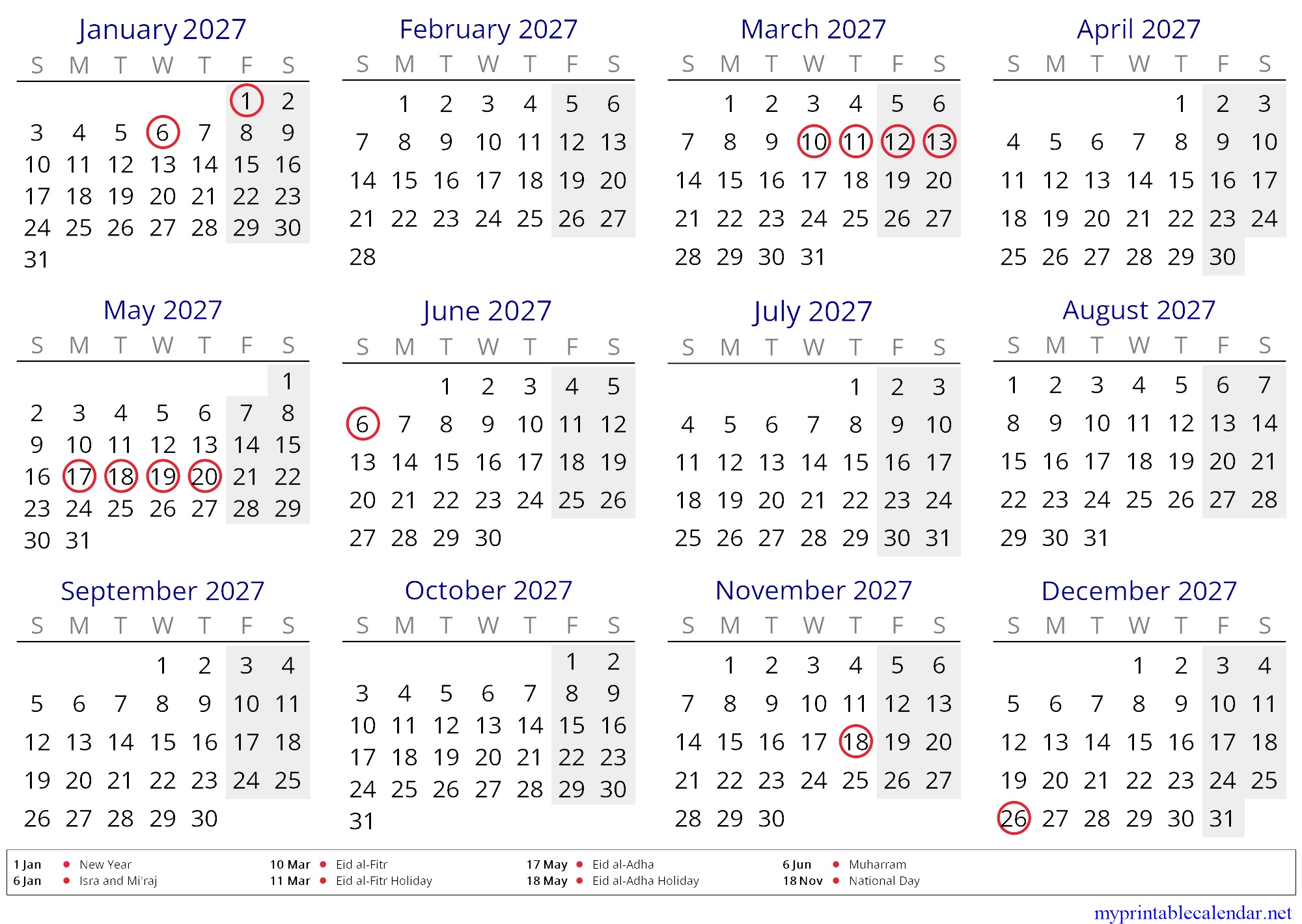 Yearly calendar for 2027, Oman, in English jpg