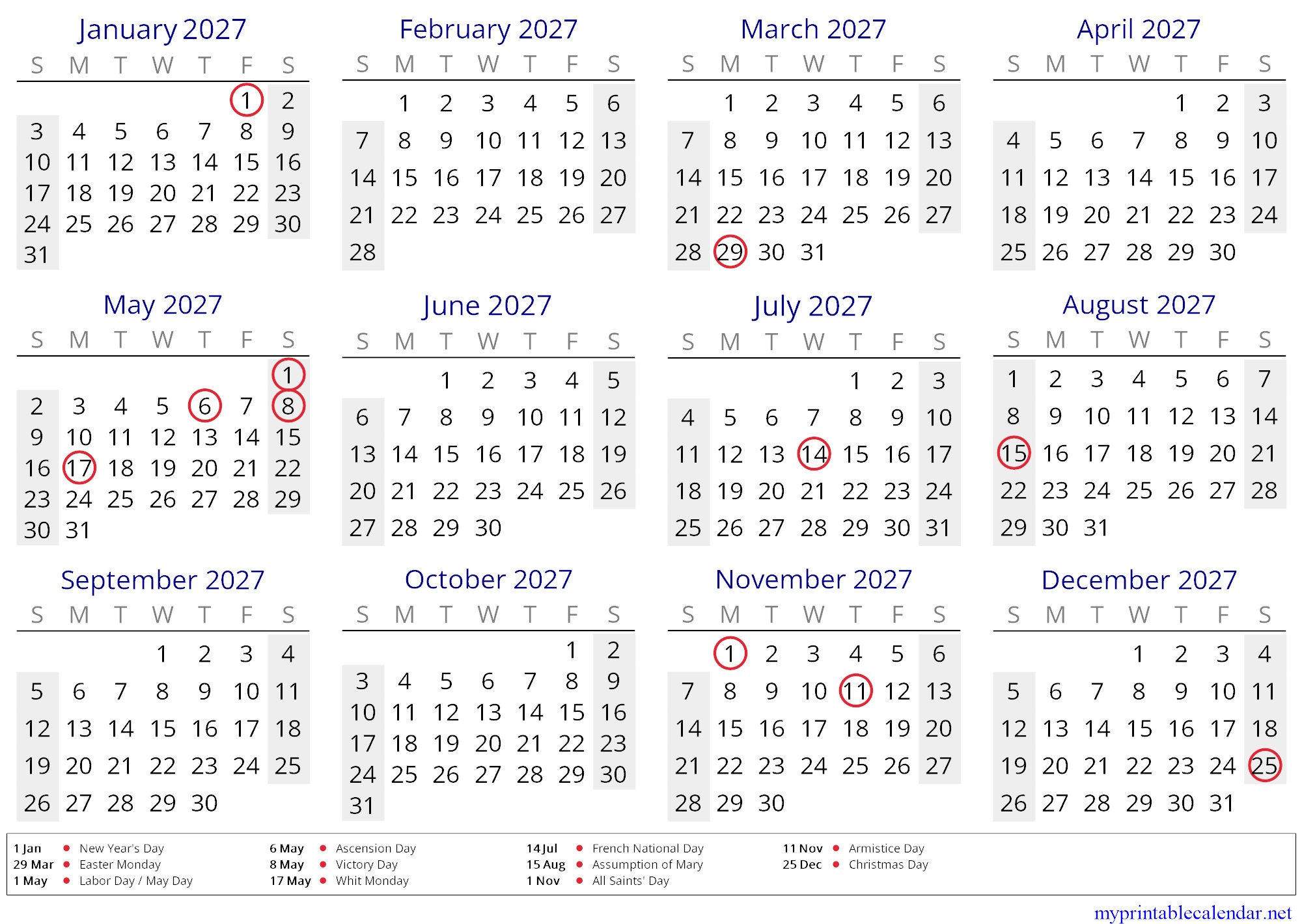 Yearly calendar for 2027, Saint Pierre and Miquelon, in English jpg