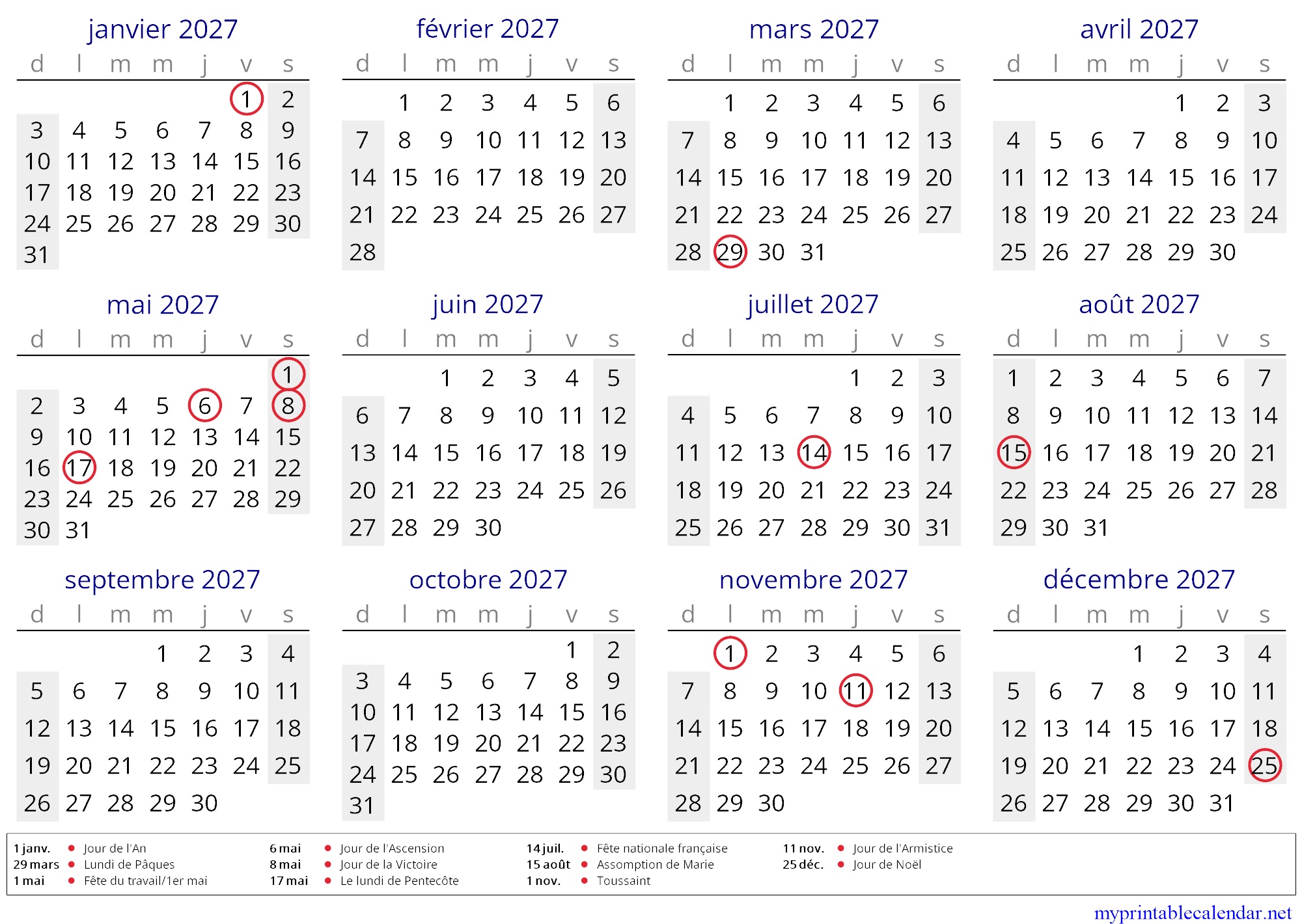 Yearly calendar for 2027, Saint Pierre and Miquelon, French jpg