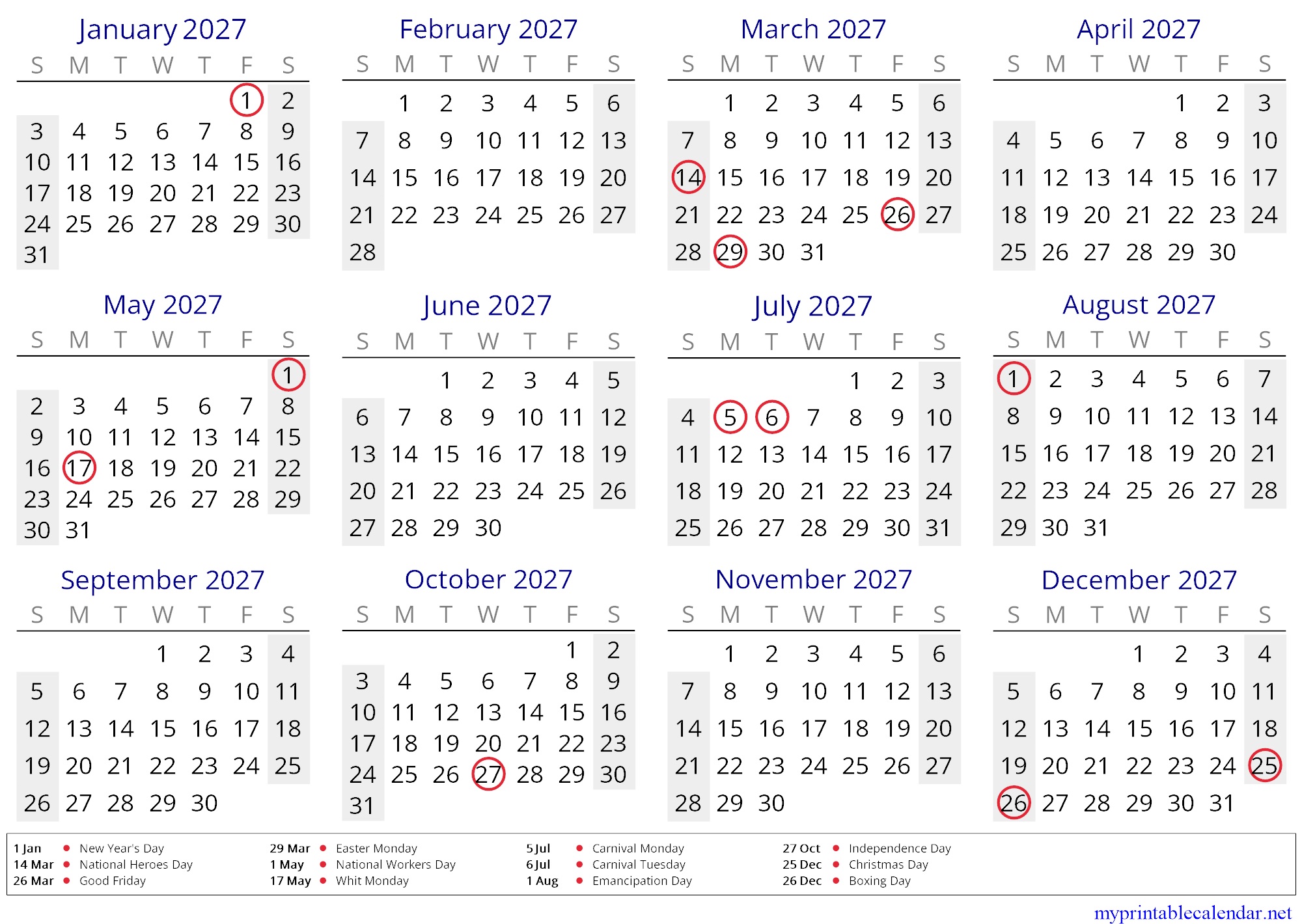 Yearly calendar for 2027, Saint Vincent and the Grenadines, English jpg