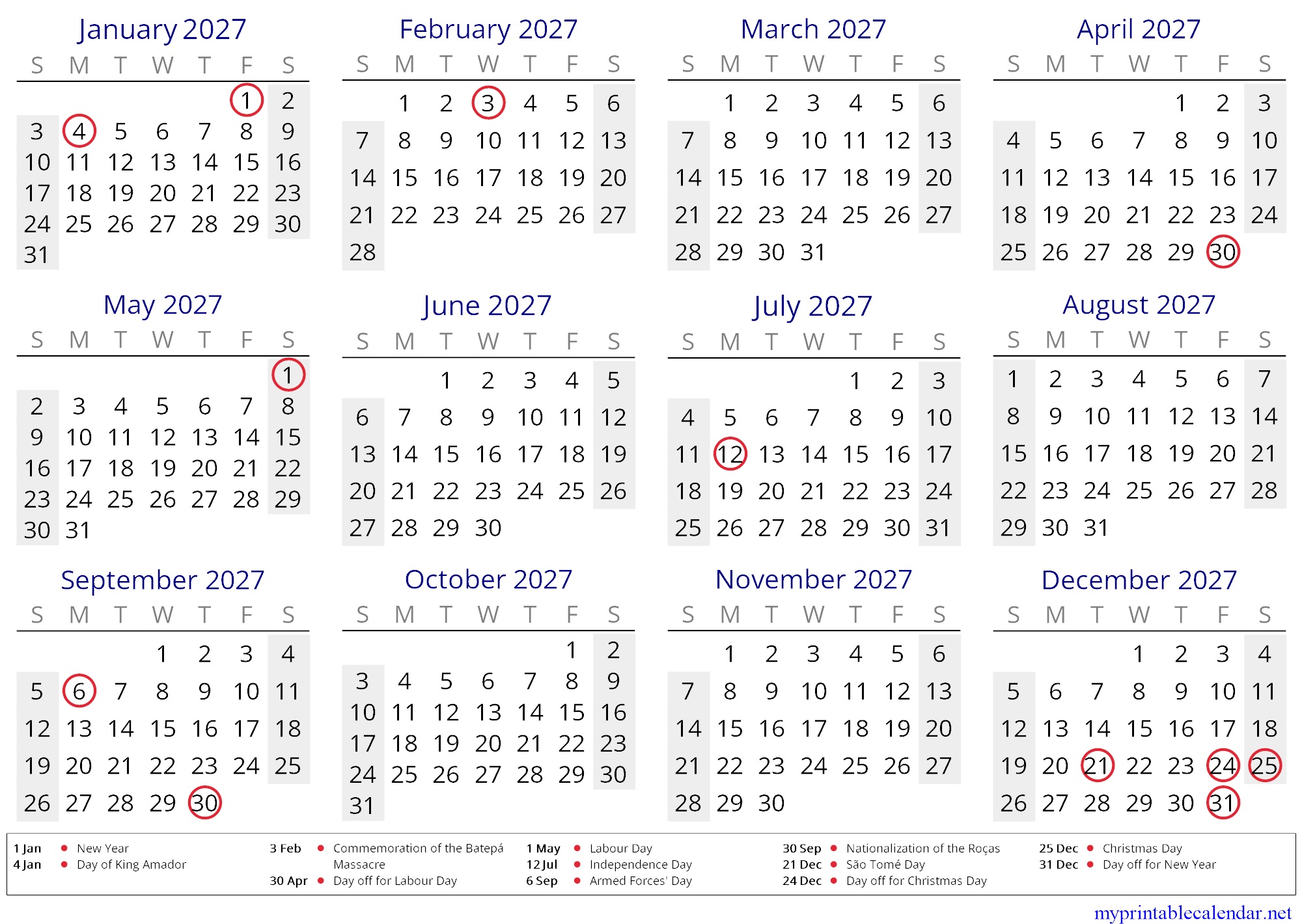 Yearly calendar for 2027, Sao Tome and Principe, in English jpg