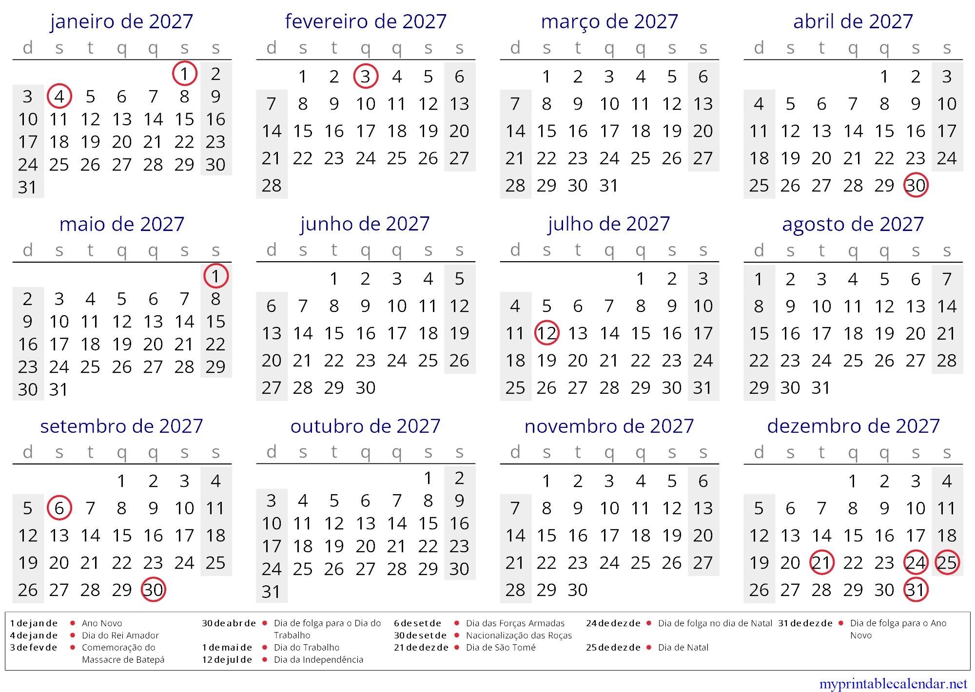 Yearly calendar for 2027, Sao Tome and Principe, Portuguese jpg