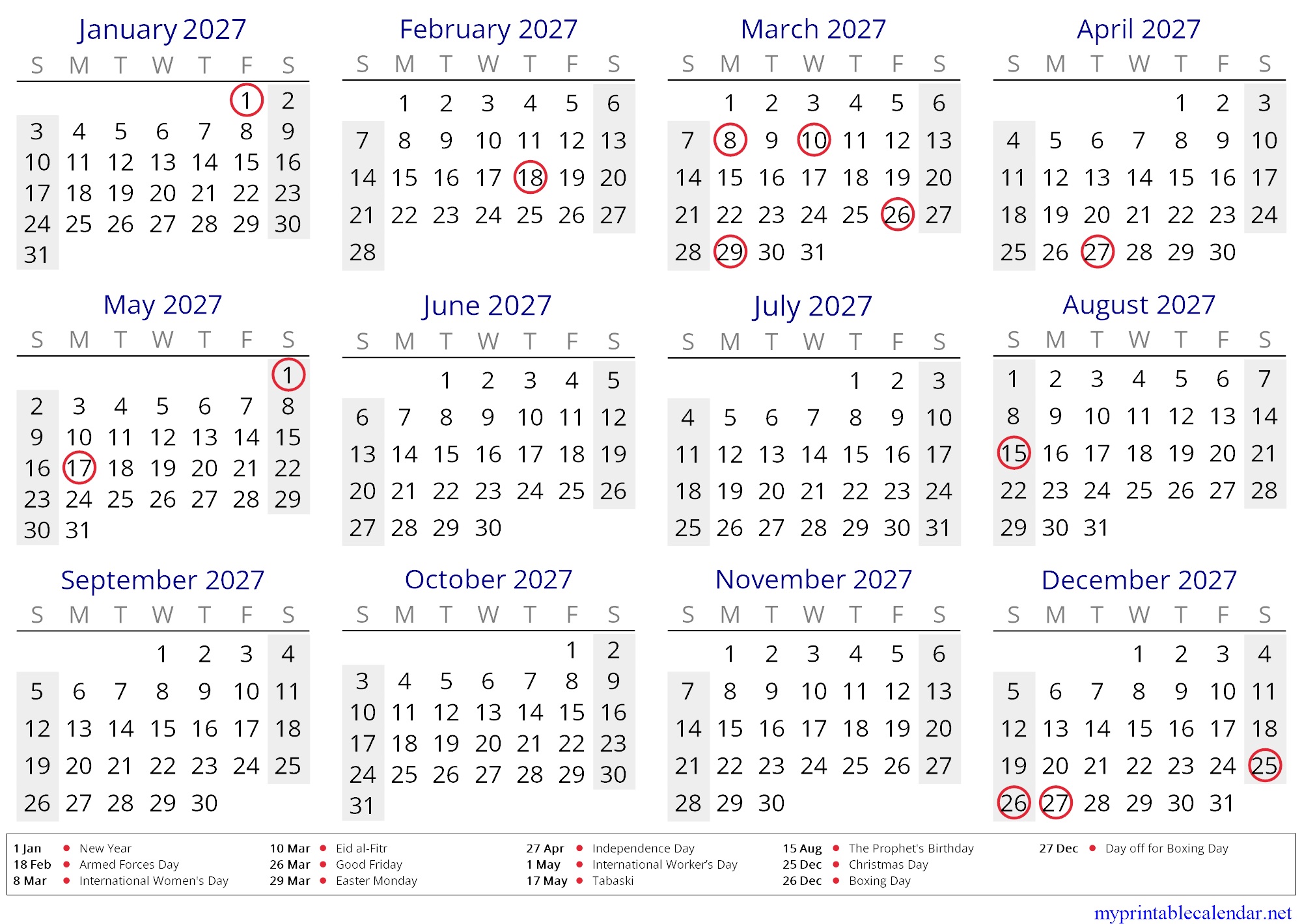 Yearly calendar for 2027, Sierra Leone, English jpg