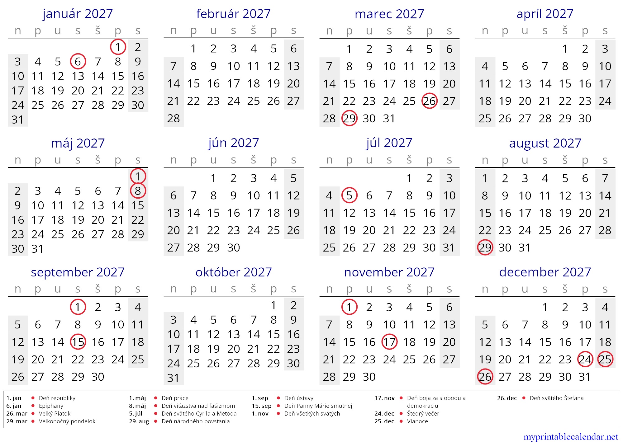 Yearly calendar for 2027, Slovakia, Slovak jpg