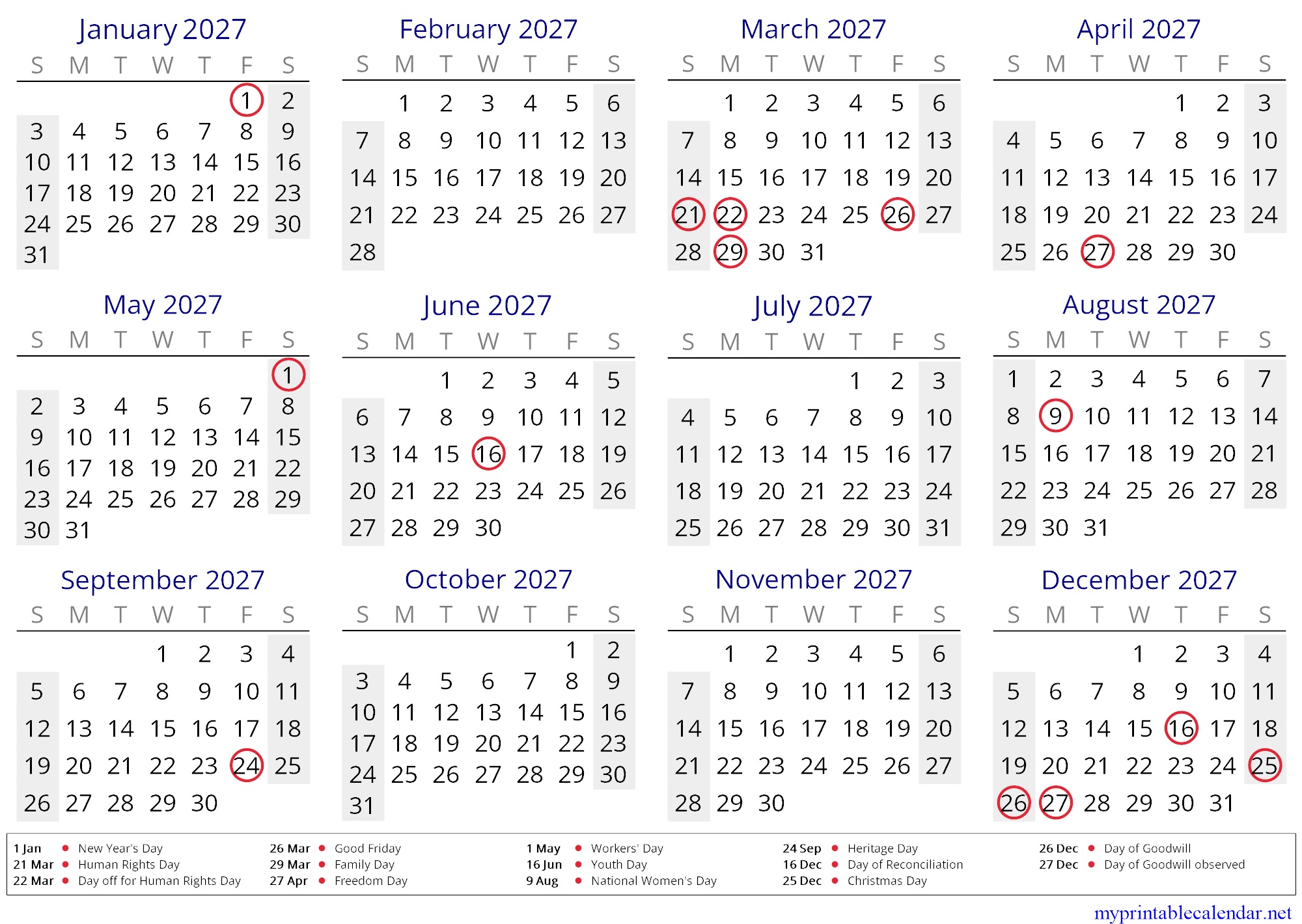Yearly calendar for 2027, South Africa, English jpg