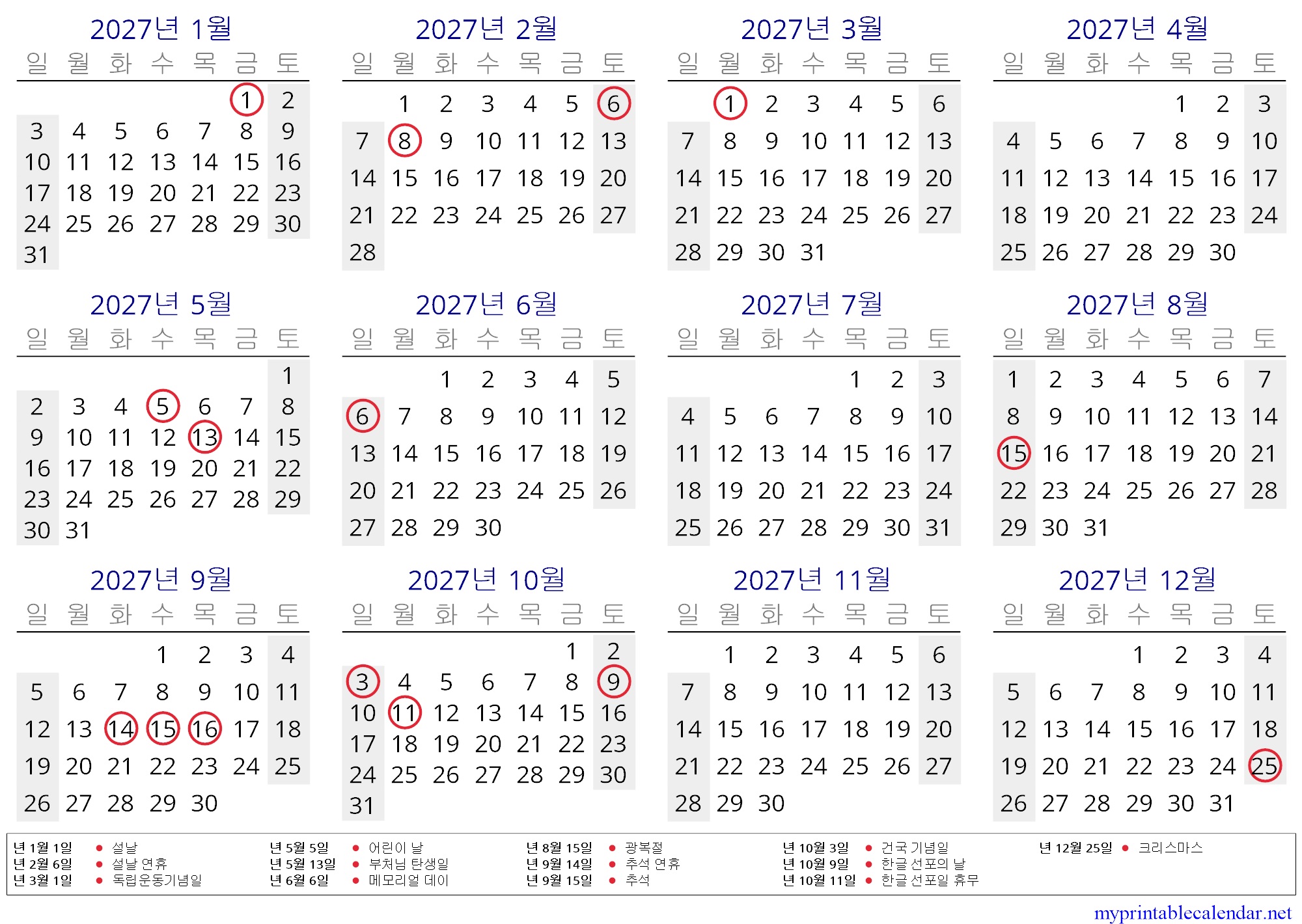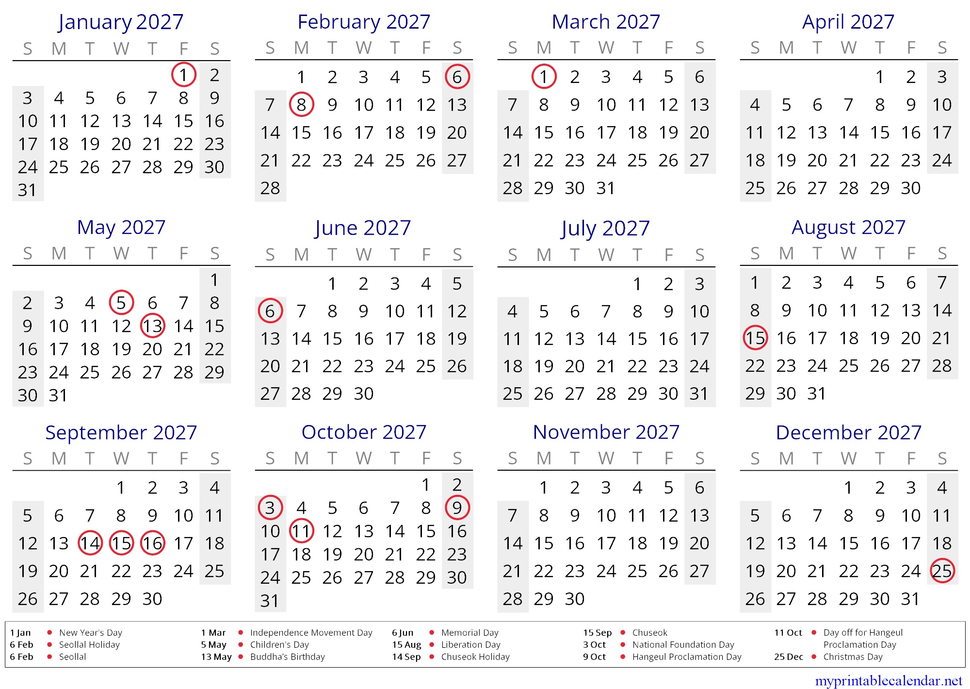 Yearly calendar for 2027, South Korea, in English jpg