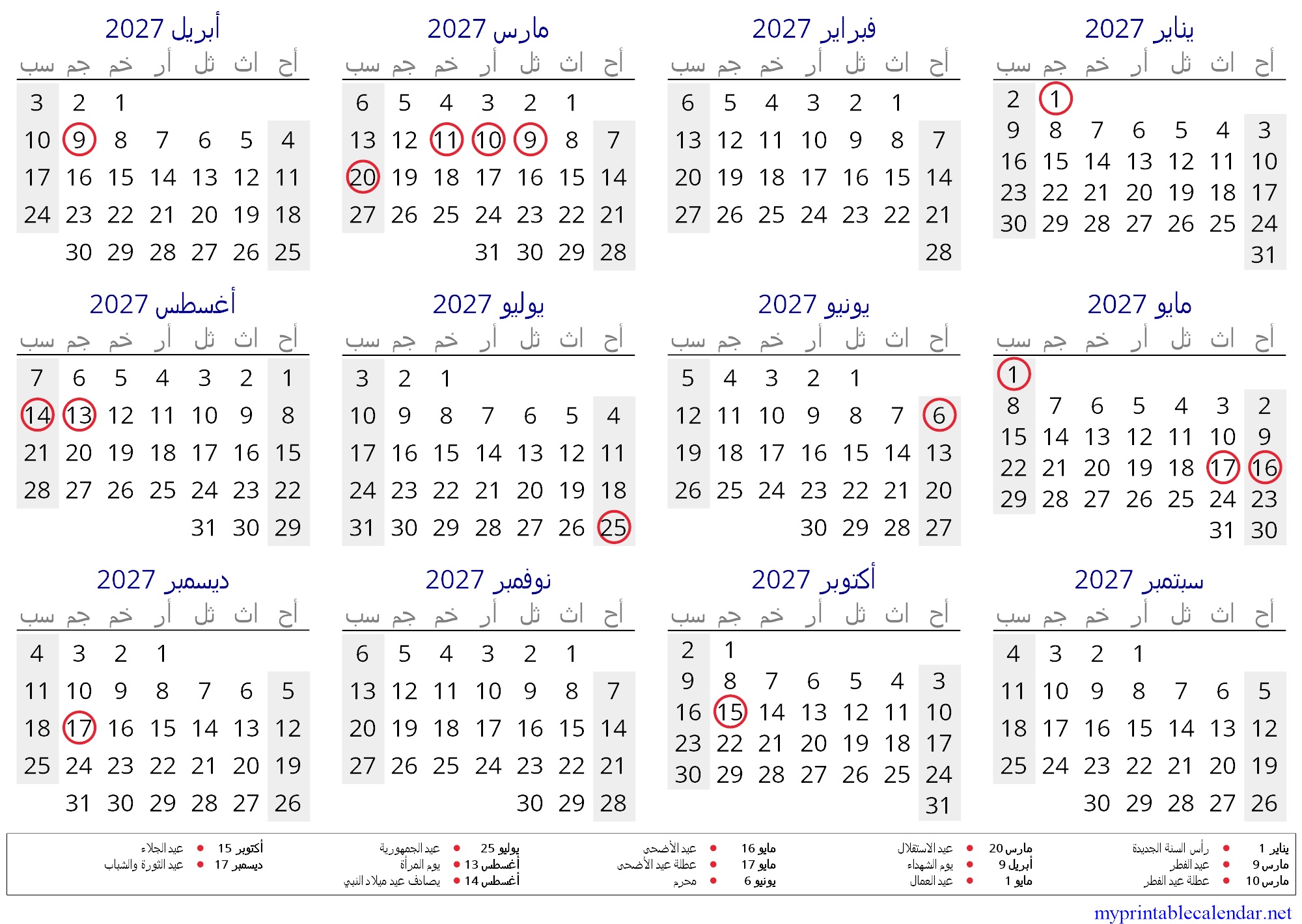 Yearly calendar for 2027, Tunisia, Arabic jpg