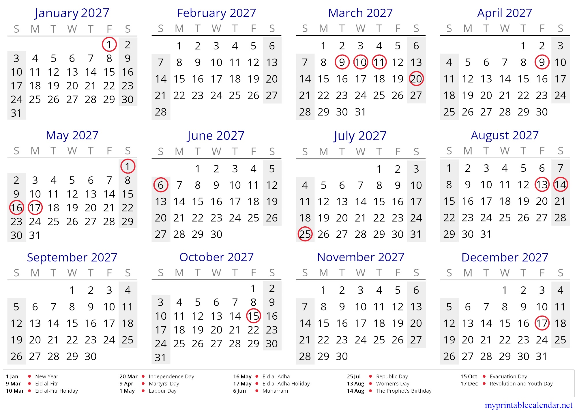 Yearly calendar for 2027, Tunisia, in English jpg