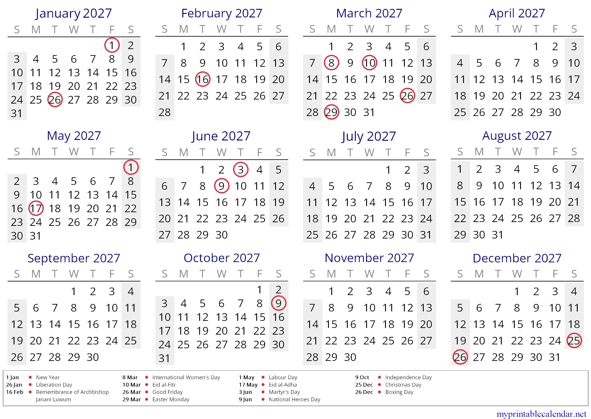 Yearly calendar for 2027, Uganda, English jpg