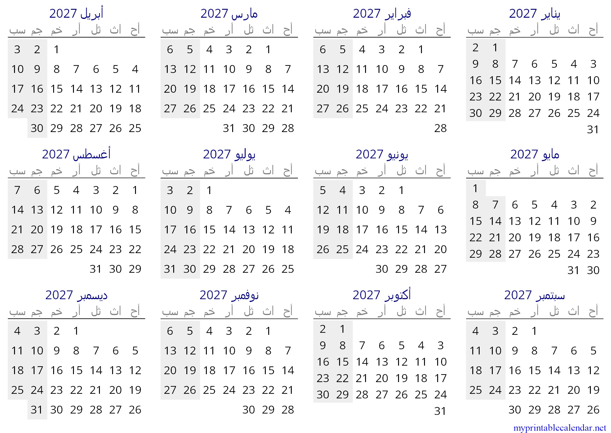 Yearly calendar for 2027, United Arab Emirates, Arabic jpg