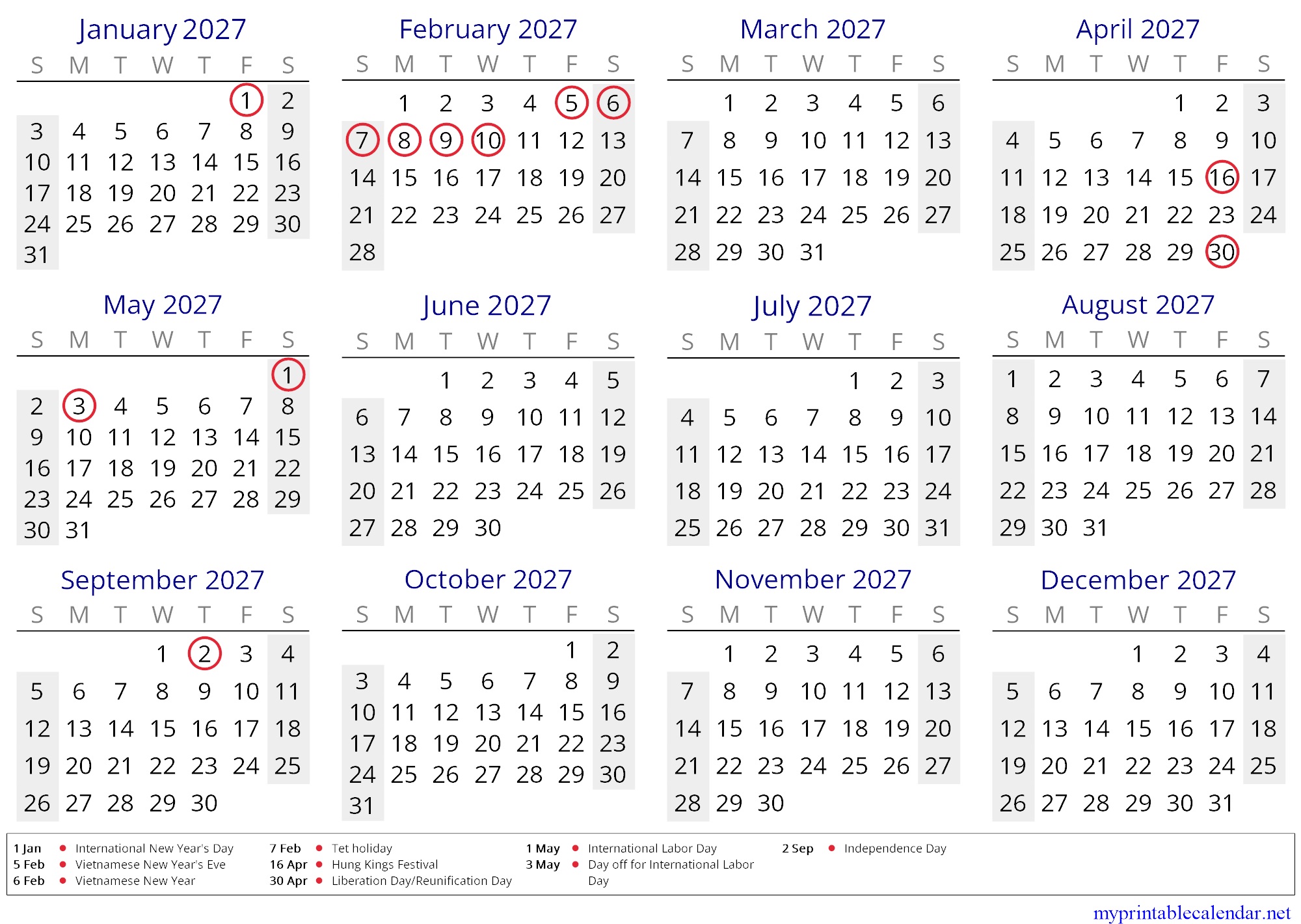 Yearly calendar for 2027, Vietnam, in English jpg