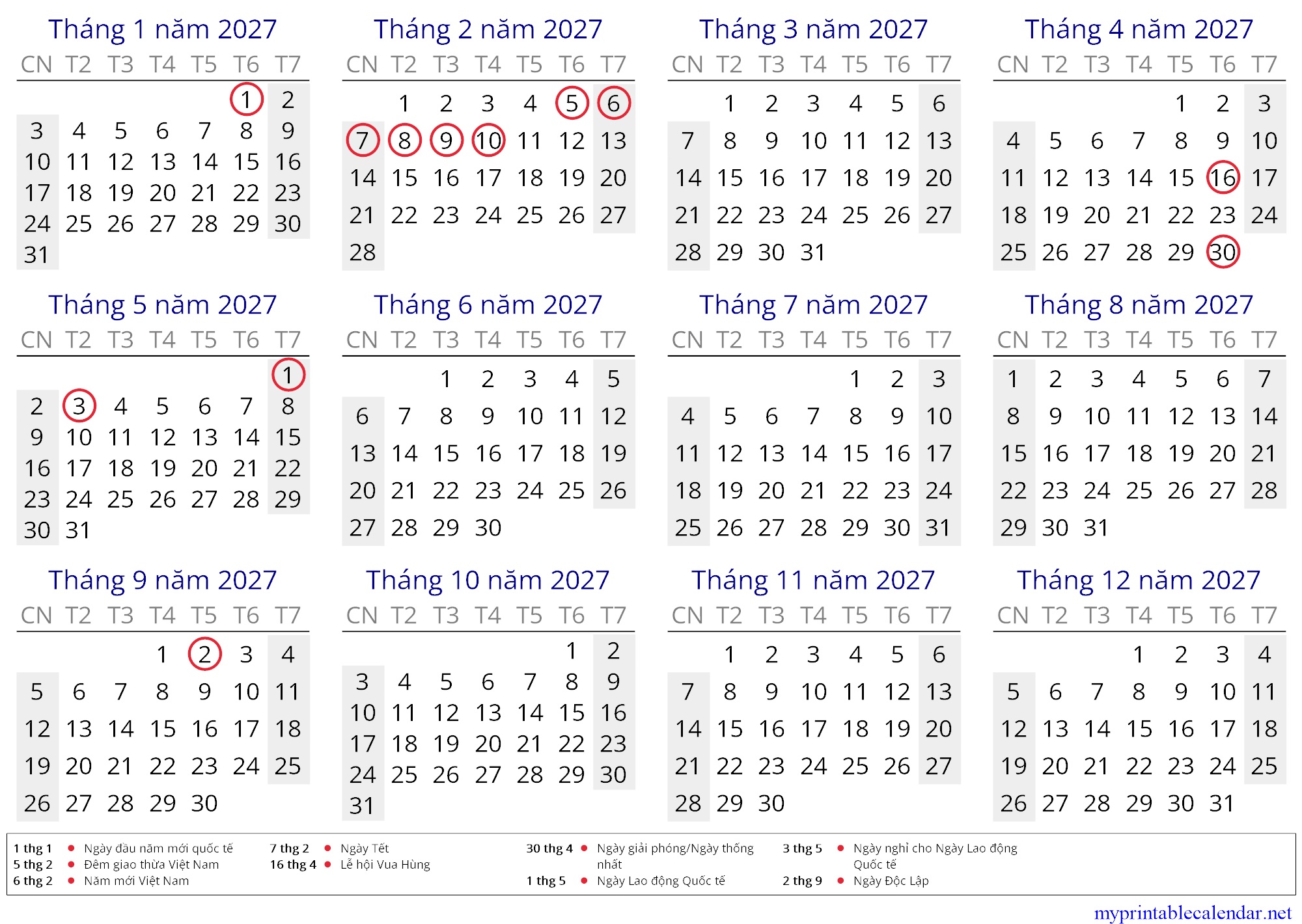 Yearly calendar for 2027, Vietnam, Vietnamese jpg